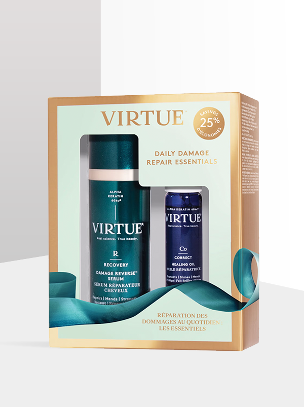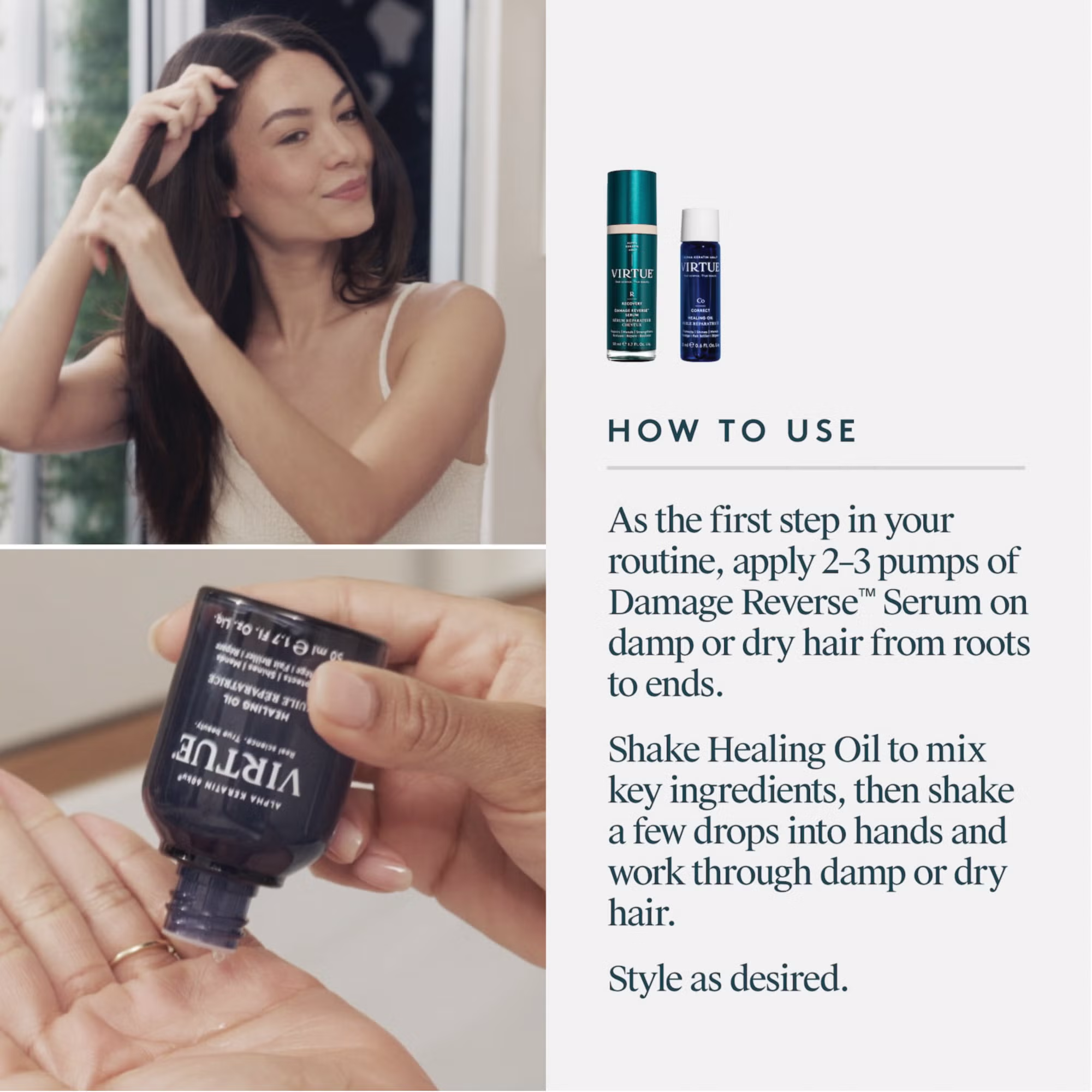 Transform dry, damaged hair with Virtue’s Daily Damage Repair Essentials Kit, featuring the Reverse Serum and Healing Oil. Powered by Alpha Keratin 60ku, this dynamic duo repairs and protects hair while restoring shine and smoothness. The Reverse Serum is a powerhouse blend of biomimetic peptides and nourishing extracts that target weakened strands, improving strength and promoting a healthy scalp. Complementing this, the Healing Oil infuses dry lengths with moisture and brilliance, utilizing Tahitian tiare flower and Kalahari melon seed oil to shield against environmental aggressors and maintain hydration. Together, they are your ultimate solution for revitalized, resilient hair.